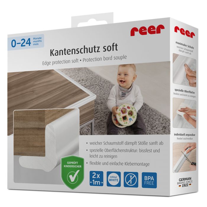 The Reer Soft Edge Protector Foam Tape in white is designed to protect children from injuries caused by sharp edges on furniture and window sills. Made from soft, shock-absorbing foam, it effectively cushions impacts. The tape is durable, bite-resistant, and easy to clean. It can be cut to the required length for a perfect fit and is easy to install and remove without leaving any residue.